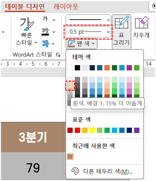 ‘테이블 디자인 탭 > 테두리 그리기’에서 선 굵기 0.5pt, 펜 색은 밝은 회색 정도로 설정합니다.