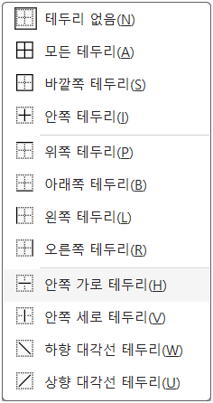 그 다음 그 옆에 있는 ‘테두리’ 목록에는 ‘안쪽 가로 테두리’를 선택하여 설정한 선을 적용하여 생성합니다.