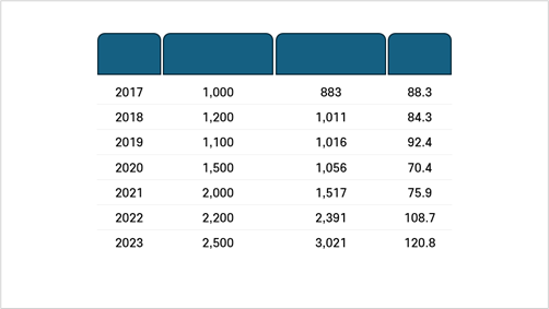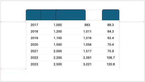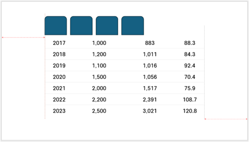 열 너비가 모두 동일할 수도 있겠지만 저는 항목마다 조금 다르게 만들어 볼 건데요. 연도와 달성률 열의 너비를 같은 너비로 조금 짧게 하고 목표와 매출 열의 너비를 같은 너비로 조금 길게 하겠습니다.
