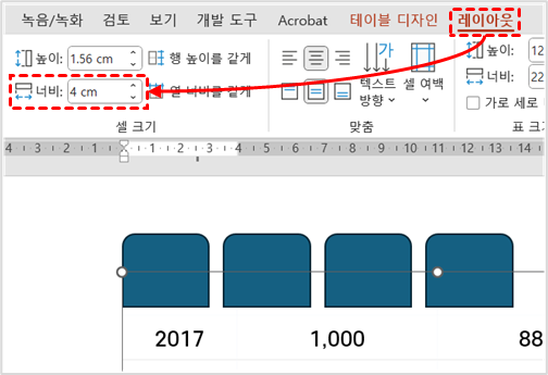 연도 항목을 클릭한 뒤, ‘레이아웃 탭 > 셀 크기’에서 너비에 4를 입력합니다. 그 다음 달성률 항목을 클릭하고 F4 키(이전 작업 반복)를 눌러 똑같이 4cm로 설정합니다. 다음은 목표와 매출 항목을 드래그하여 다중선택 한 후 너비에 7을 입력합니다.