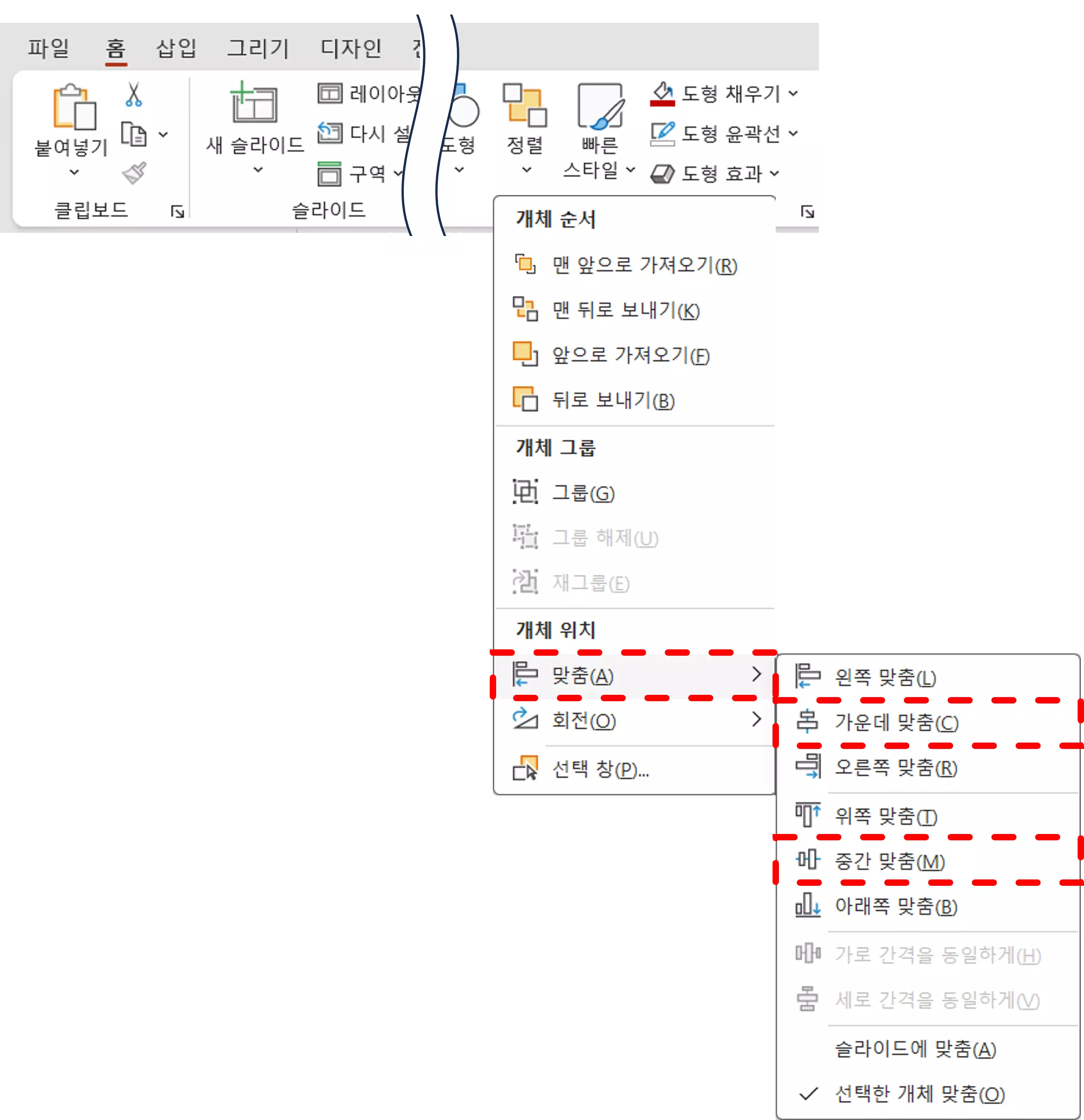 우선 두 개의 개체를 모두 선택한 후 리본메뉴의 정렬 > 맞춤 > 가운데 맞춤, 중간 맞춤을 순서대로 클릭합니다. 여기까지 따라오셨다면 아래와 같은 결과물을 확인하실 수 있습니다.