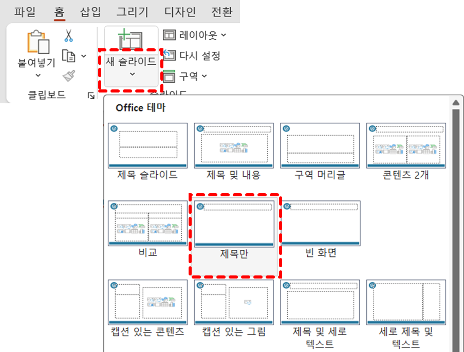 홈 탭으로 돌아온 뒤 새 슬라이드 버튼을 클릭하여 ‘제목만’ 레이아웃을 선택합니다. 저는 개인적으로 ‘제목만’ 또는 ‘빈 화면’ 레이아웃만 사용합니다.