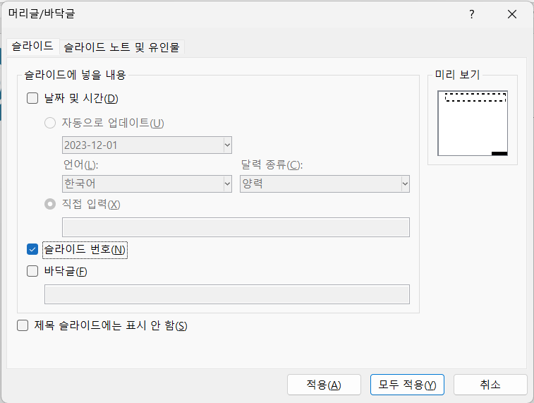 날짜 및 시간, 슬라이드 번호, 바닥글을 표시하도록 할 수 있는데요. 저는 슬라이드 번호만 사용할 거니까 슬라이드 번호만 체크하고 모두 적용을 클릭합니다.
