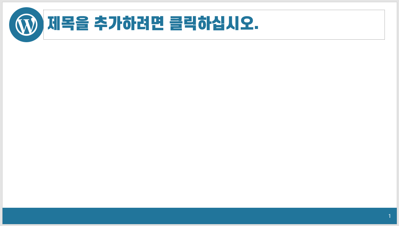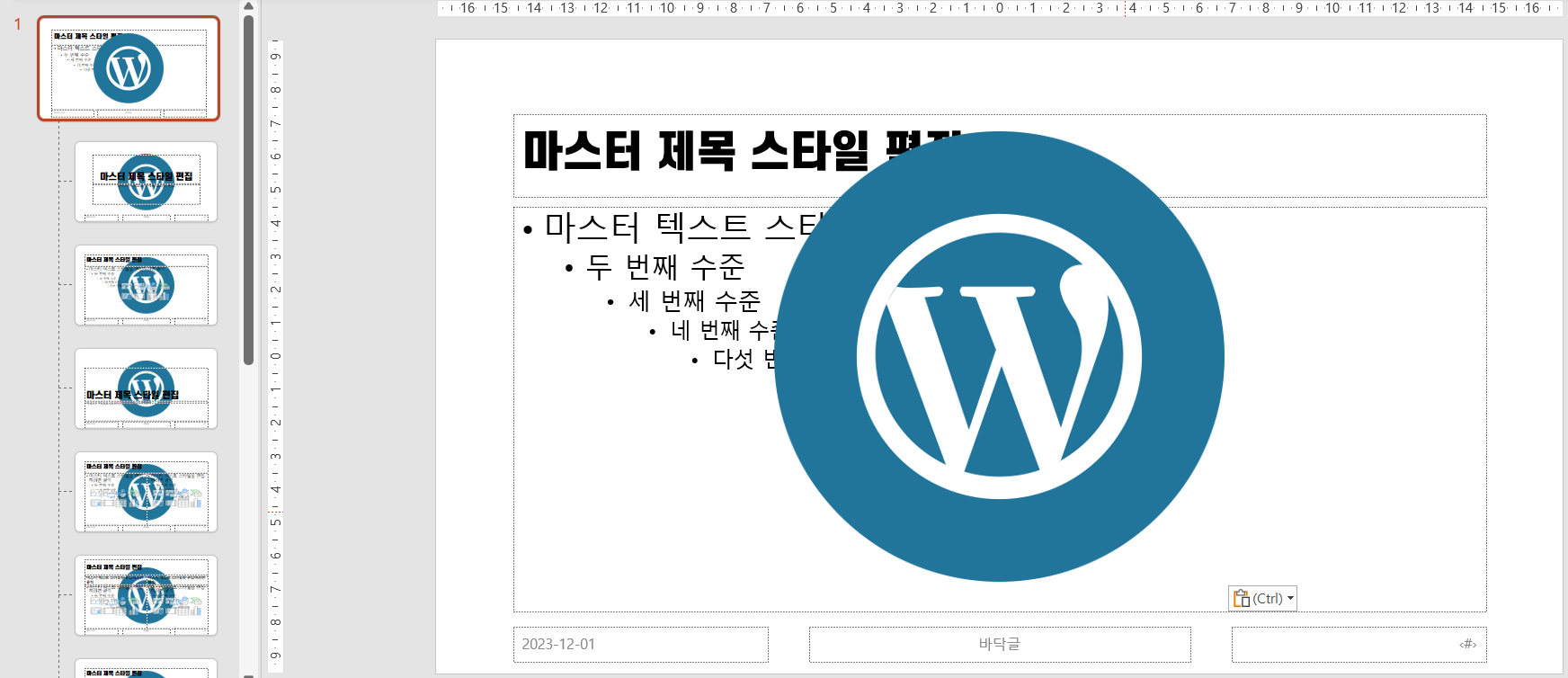 워드프레스 로고이미지를 불러와 봤습니다. 왼쪽을 보시면 맨 위 마스터 슬라이드에만 이미지를 넣었음에도 하위 레이아웃에도 일괄적으로 적용된 것을 볼 수 있습니다.